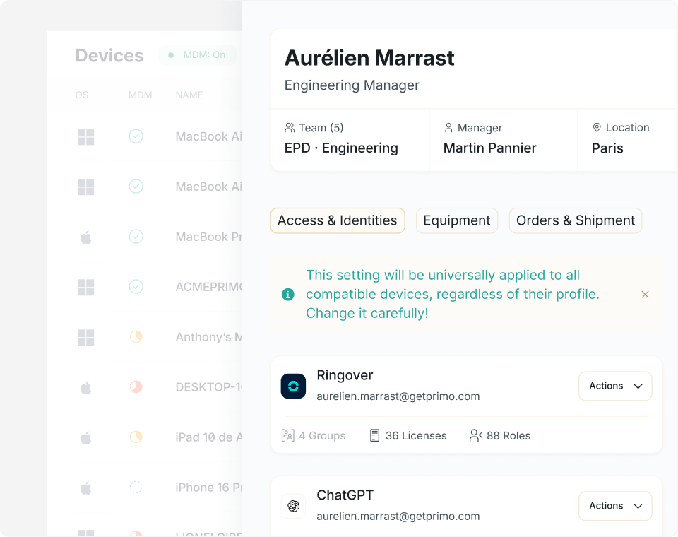 Gestiona dispositivos, accesos y licencias en un solo lugar y automatiza el onboarding y el offboarding sin perseguir a nadie.